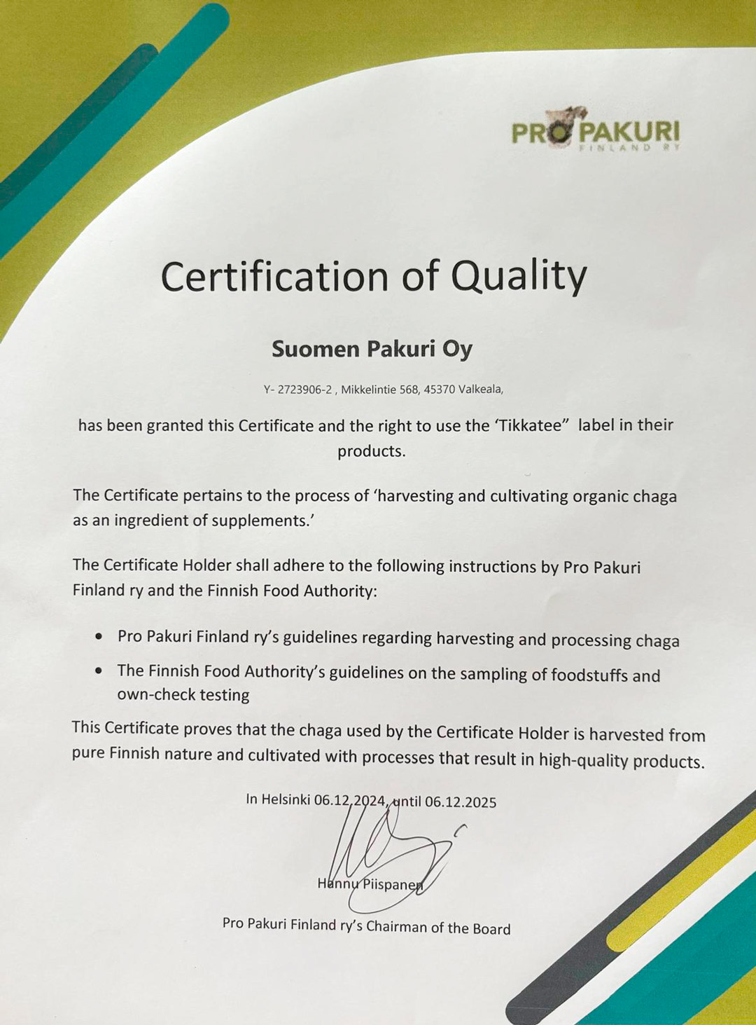 We provides pure chaga mushroom and further processed chaga products for food industry, for example. For forest owners we offer a turn-key service for beginning their own chaga cultivation.